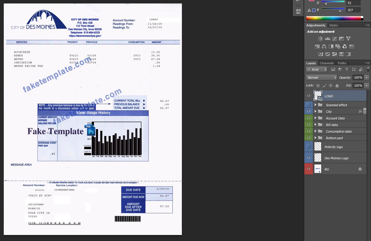 Iowa Water Utility Bill Template: Iowa Proof of address psd template